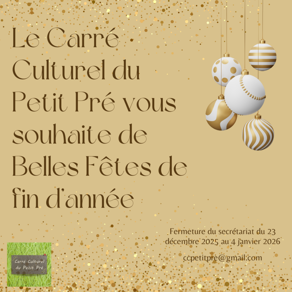 Le Carré Culturel du Petit Pré vous souhaite de belles fêtes de fin d’année ! Le secrétariat sera fermé du 23 décembre 2025 au 4 janvier 2026.